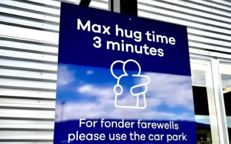 O aeroporto internacional de Dunedin, cidade da Nova Zelândia, criou um limite de três minutos para abraços para manter o fluxo de passageiros e carros na área de desembarque do aeroporto. Uma placa colocada no local alerta: “Tempo máximo de abraço: 3 minutos. Para despedidas mais calorosas, por favor, use o estacionamento”. As informações são da CNN e do jornal The Guardian.