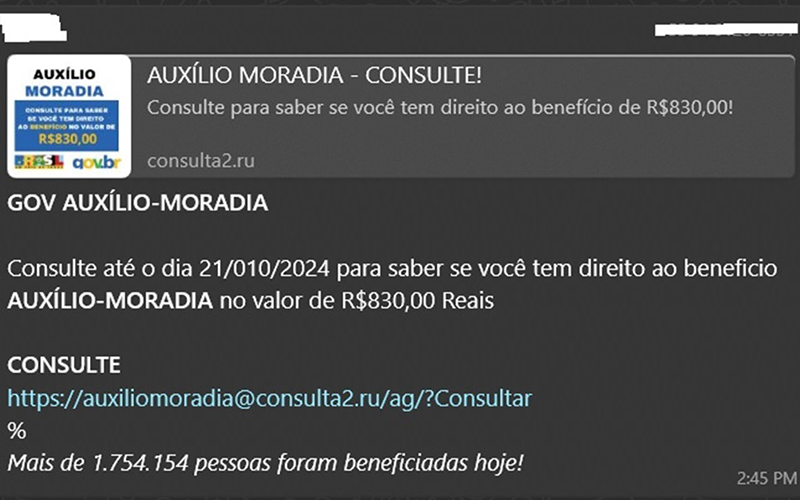 Desde o último final de semana, em grupos de mensagens da região Sul do Pará tem circulado um link com uma mensagem sobre o “Auxílio Moradia”. Trata-se de um golpe digital, que usa a identidade visual do Governo Federal e o nome de um programa real para enganar as vítimas. Tenha cuidado, pois acessar, mesmo que por acidente, pode entregar o controle do aparelho a criminosos digitais, que podem acessar dados pessoais, fotos e informações sensíveis.