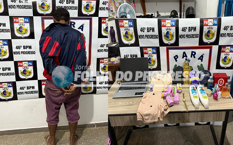 Foto: Divulgação/ 46º BPM | Na noite desta quarta-feira (29), por volta das 23h40, a Polícia Militar de Novo Progresso realizou a prisão em flagrante de um indivíduo acusado de furto a uma residência no bairro Jardim Paraíso. O imóvel pertence a assessora do vereador Naldo.