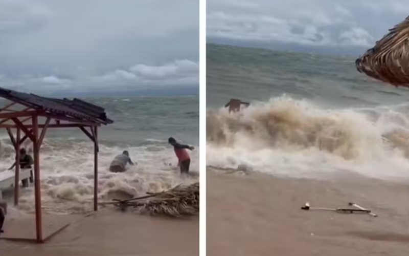 Durante o vendaval, donos de barracas de arriscaram entrando no rio agitado para tentar salvar cadeiras, mesas e outros objetos arrastados pelo vendaval para dentro do rio. (veja o vídeo abaixo)