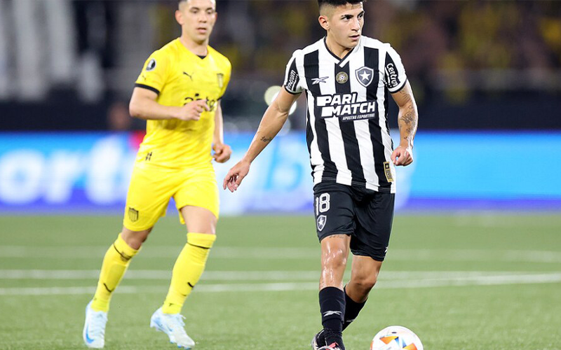Foto: Reprodução | Alex Telles e Savarino incomodam. Depois do abafa uruguaio, o Botafogo saiu para o jogo e, se aproveitando do excesso de vontade do adversário, deu sua primeira finalização aos 21 minutos: Alex Telles, em cobrança de falta quase que da intermediária, assustou e errou, por pouco, o alvo. Pouco depois, Savarino arriscou e também ficou no quase.