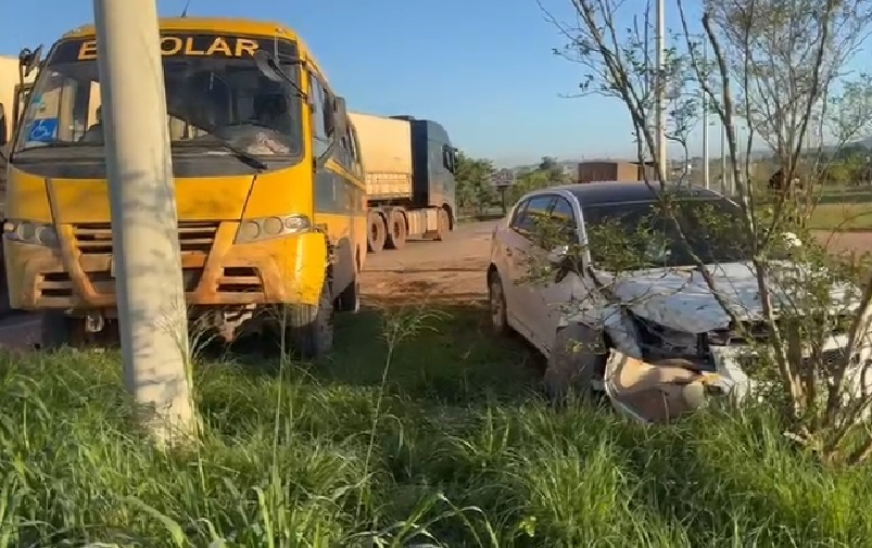 Pelas imagens é possível ver que o motorista do micro-ônibus escolar adentrou na rodovia para atravessar o cruzamento no momento que houve a colisão.