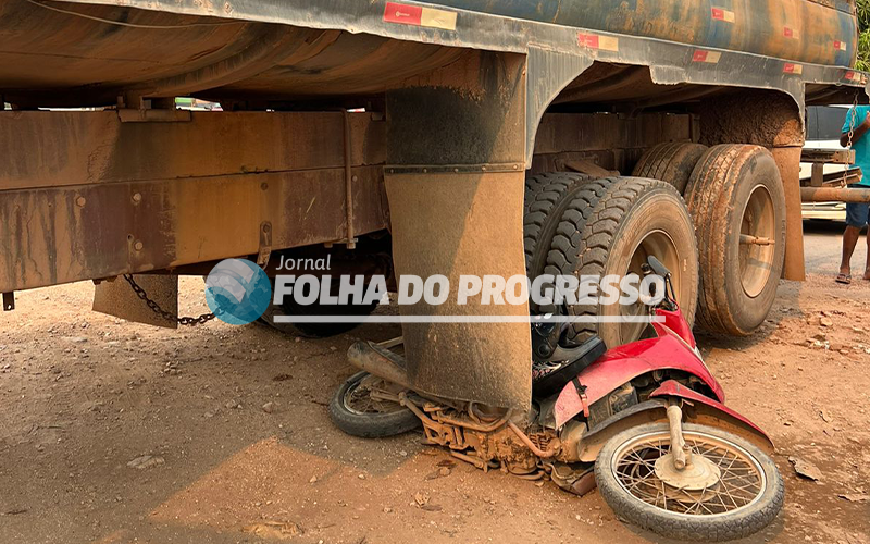 Motocicleta ficou embaixo do caminhão – (Foto:Jornal Folha do Progresso)