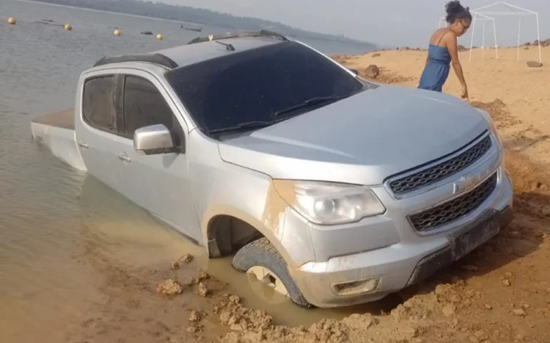 Uma caminhonete ficou atola na manhã da última quarta-feira (30) na praia do Massanori em Altamira, no sudoeste do Pará. Após invadir local proibido e deu trabalho para sair, foi necessário uma retroescavadeira para retirar o veículo da água.