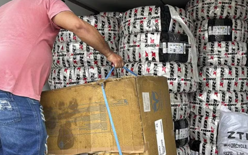 A carga de pneus apreendida pelos policiais da Base Integrada — Foto: Divulgação