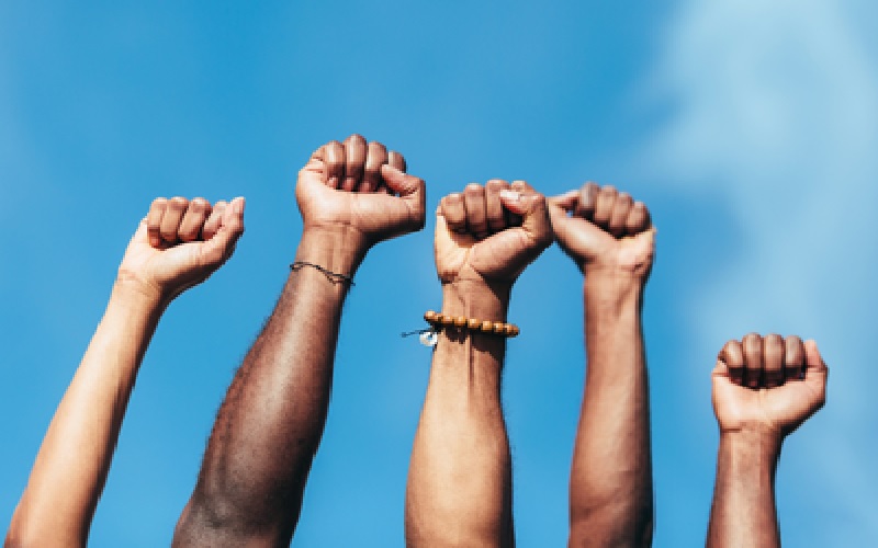A imagem mostra cinco braços erguidos com os punhos cerrados contra um céu azul. Os braços têm diferentes tons de pele e alguns usam acessórios como pulseiras de contas ou fios amarrados nos pulsos.