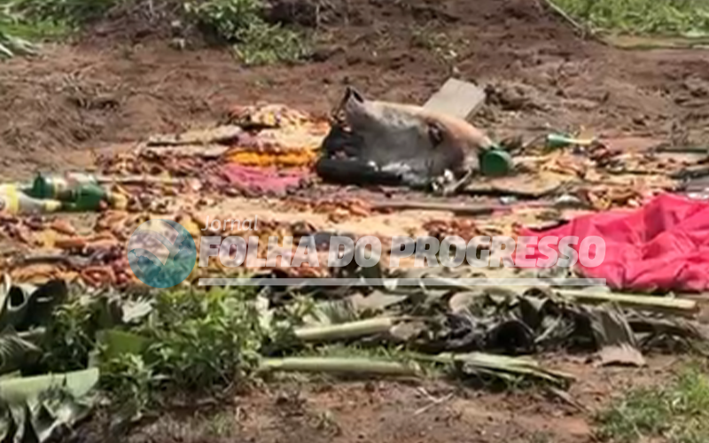 Foto: Jornal Folha do Progreso | Uma cabeça de animal, garrafas de cachaça, vinho, cervejas, velas e muitas frutas.