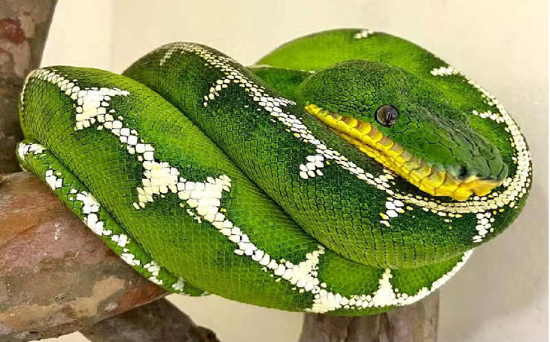 É uma das atrações, digamos assim, do Centro Amazônico de Herpetologia, em Benevides, Região Metropolitana de Belém. Esta espécie de serpente (Corallus batesii) é da mesma família da jiboia, nasce nas cores vermelho e alaranjado. Segundo a responsável técnica do espaço, Milena Almeida, a cobra-papagaio passa adquirir uma coloração verde a partir do 6º mês. O animal vive na copa das árvores, não é venenosa e mata as presas por constrição.