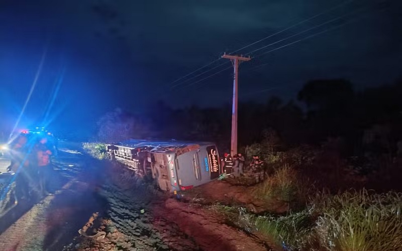 Ainda de acordo com a PRF, o acidente ocorreu por volta de 1h, no km 536. O motorista do caminhão seguia pela rodovia, quando invadiu a pista contrária e bateu de frente contra o ônibus de viagem, que tombou fora da pista.