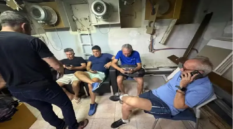 Nélio Aguiar e outros brasileiros em bunker em Israel — Foto: Divulgação