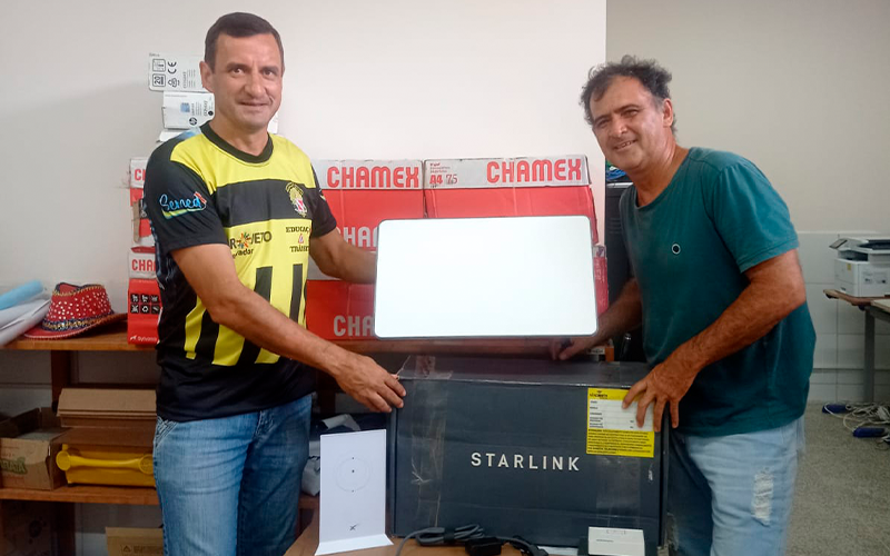 Gilberto Luiz dos Santos, diretor da escola estadual de Novo Progresso, divulgou imagem nesta sexta-feira, 12 de julho de 2024, recebendo uma unidade da antena que já está sendo instalada nas dependências da escola. “Escola Waldemar Lindermayer recebendo a antena Starlink e o técnico para instalação Satrlink”,divulgou Gilberto.