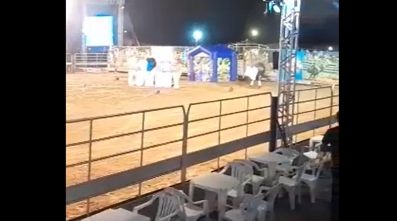 No vídeo é possível ver que, no momento em que o narrador trabalha com as montarias em touro, havia poucas pessoas no local do evento.