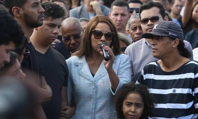 Deputada Flordelis discursa durante o enterro do marido, pastor Anderson, na última segunda-feira. Ao lado, de óculos escuros e camisa xadrez está Flávio, que admitiu à polícia participação no crime Foto: Fabiano Rocha / Agência O GLOBO