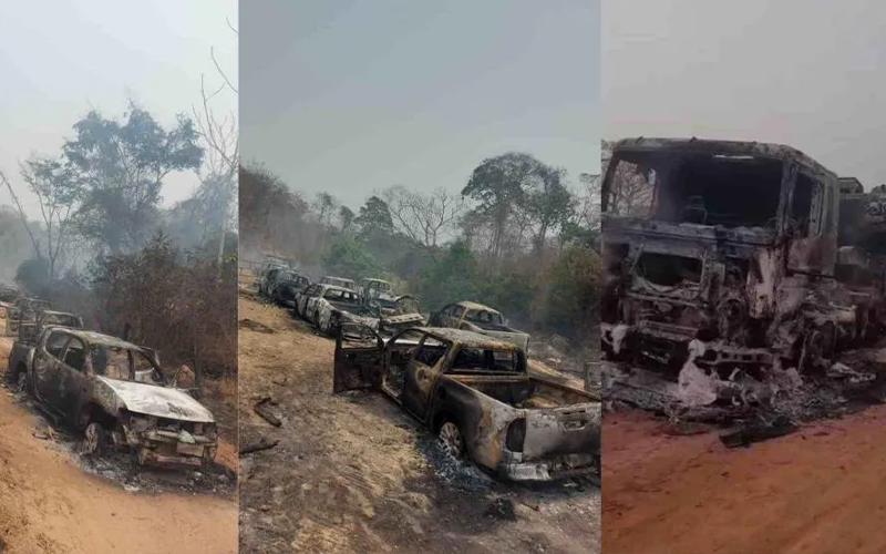 Fotos e vídeos que circulam nas redes sociais mostram uma carreta prancha transportando uma máquina queimada, além de várias caminhonetes e veículos de pequeno porte completamente destruídos.