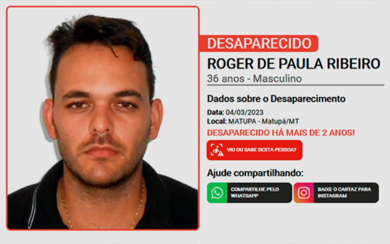 Foto: Reprodução | Há exatamente 1 ano e 8 meses o empresário de Sorriso, Roger de Paula Ribeiro, 37 anos, está desaparecido. Ele “sumiu” no dia 4 de março de 2023. No último contato de Roger, ele enviou um vídeo dizendo que estava em Matupá e, desde então, não deu mais notícias.