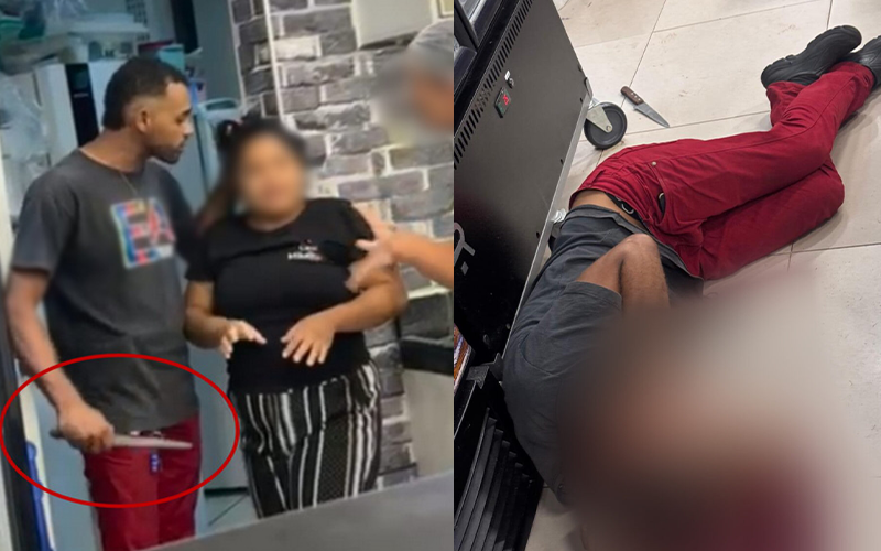 Um homem identificado como Jhonatan Alves Barros Nogueira foi baleado de raspão após ameaçar a ex-esposa com uma faca em um estabelecimento, no bairro Amapá, em Marabá, no sudeste paraense. O caso ocorreu por volta das 15h40 deste domingo (1º) na lanchonete da Havan localizada no município. Em vídeo que circula pelas redes sociais, Jhonatan segura a mulher pelos cabelos enquanto exige o celular dela.