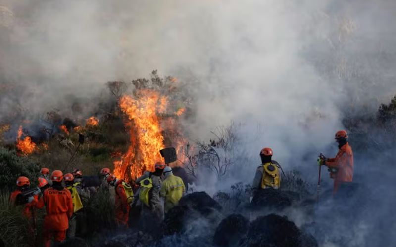 Brigadistas do Parque Nacional do Itatiaia, bombeiros e voluntários atuam para conter incêndio que teve início na última sexta-feira (14) — Foto: Ernesto Carriço/AFP/15-06-2024