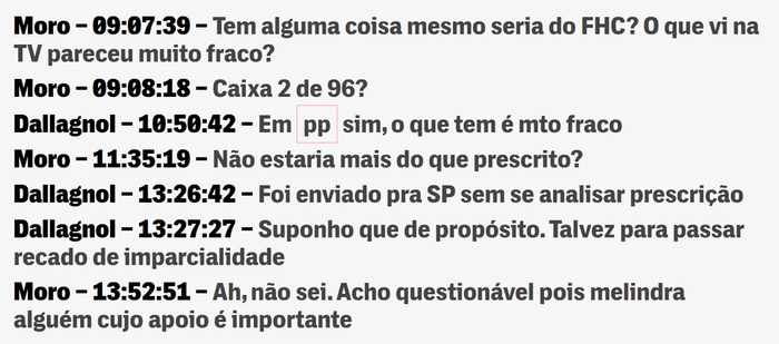 O Intercept Brasil conta que, naquele dia, “Moro chamou Deltan Dallagnol em um chat privado no Telegram para falar sobre o assunto. O juiz dos processos da Lava Jato em Curitiba queria saber se as suspeitas contra o ex-presidente eram “sérias”. O procurador respondeu acreditar que a força-tarefa – por meio de seu braço em Brasília – propositalmente não considerou a prescrição do caso de FHC e o enviou ao Ministério Público Federal de São Paulo, segundo ele, ‘talvez para [o MPF] passar recado de imparcialidade’”.