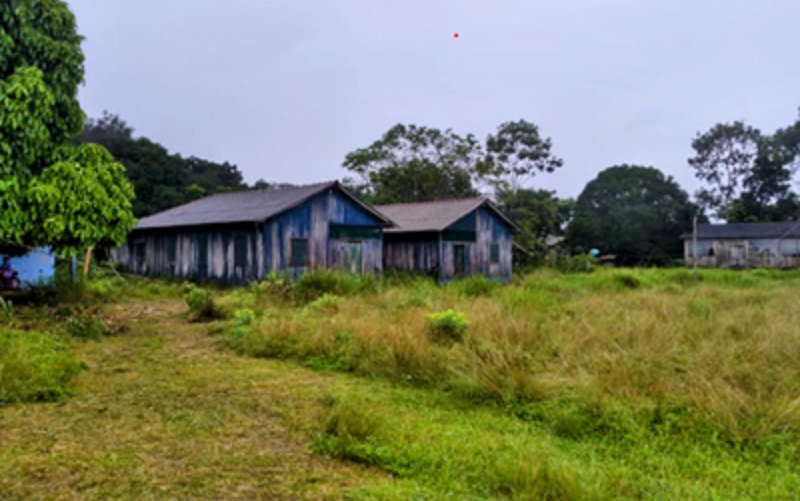 Foto em formato retangular que mostra duas casas de madeira com pintura desgastada em tons de azul e cinza, localizadas em um terreno com grama alta. À esquerda, há uma árvore grande e verde, enquanto ao fundo, são visíveis outras árvores e mais uma estrutura ao longe, parcialmente obscurecida pela vegetação. O céu está nublado.