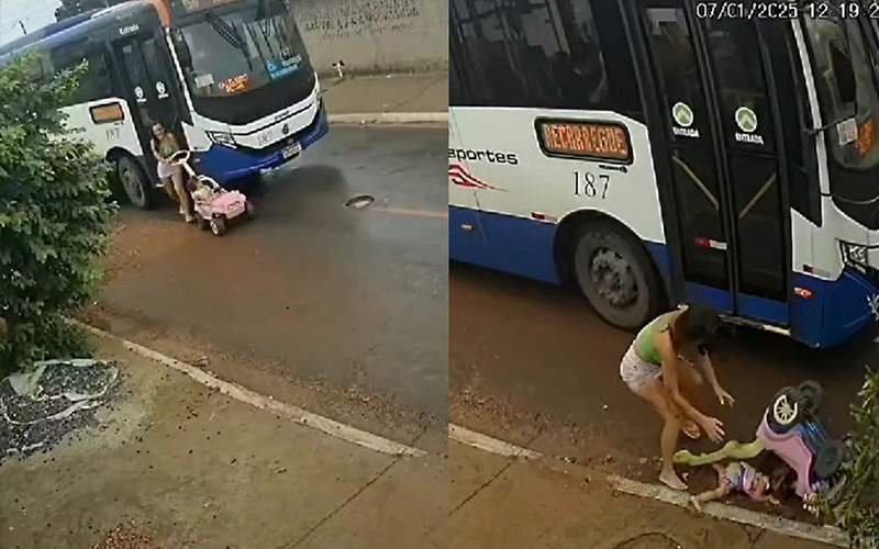 Um acidente foi registrado em Várzea Grande, Mato Grosso, quando um ônibus atropelou uma mãe que empurrava sua filha em um carrinho.