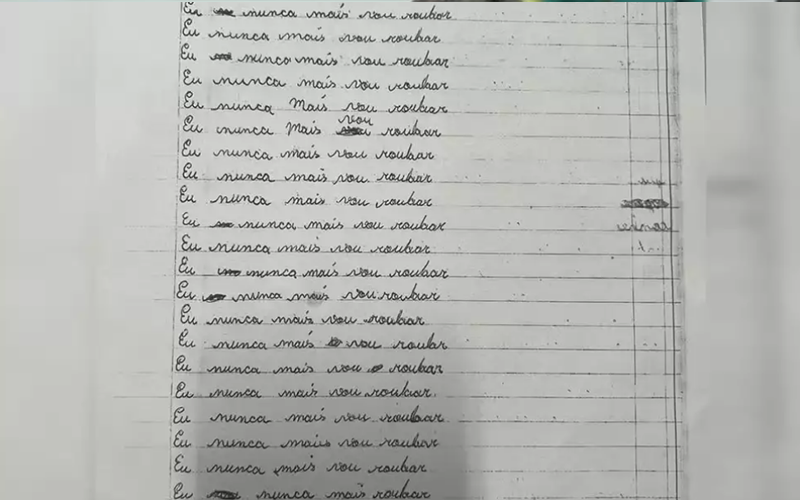 Após tomar conhecimento da ação da filha, a mãe não apenas impôs a lição, mas também decidiu levar o caso ao conhecimento das autoridades. No depoimento ao delegado, ela apresentou o manuscrito em que a adolescente repetia várias vezes a frase “Eu nunca mais vou roubar”, como uma forma de reforçar o arrependimento e a lição para a filha.