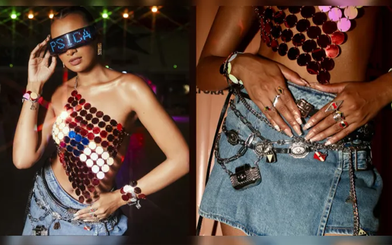 O cropped exclusivo, criado pela própria Maria Carolina, é um dos pontos centrais do look. As cores vermelho, branco e azul foram reinterpretadas com uma pegada contemporânea, misturando o brilho do prata à força do preto para dar ainda mais impacto à composição, o look era rico em detalhes, nas correntes tinham elementos em prata. “A ideia era trazer as cores do meu estado de uma forma diferente, conectando a tradição com a modernidade do Festival Psica,” destacou Maria Carolina.
