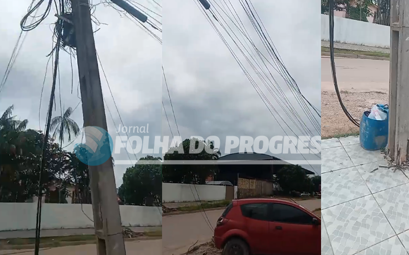 Foto: Reprodução |O Jornal Folha do Progresso recebeu imagens que mostram fios de energia espalhados pela Rua Belém, próximo à Escola João Carlos Batista. Segundo relatos, uma carreta passou pelo local e acabou enroscando nos cabos, o que deslocou um poste, que agora corre risco de cair.