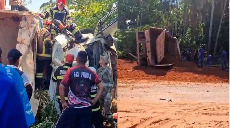 Um motorista ficou preso às ferragens de sua caçamba após o veículo tombar.