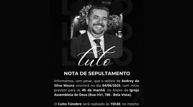 O velório será realizado no dia 04 de junho de 2025, com início previsto para as 4h da manhã, no anexo da Igreja Assembleia de Deus, localizada na Rua Iriri, nº 786 – Bairro Bela Vista.