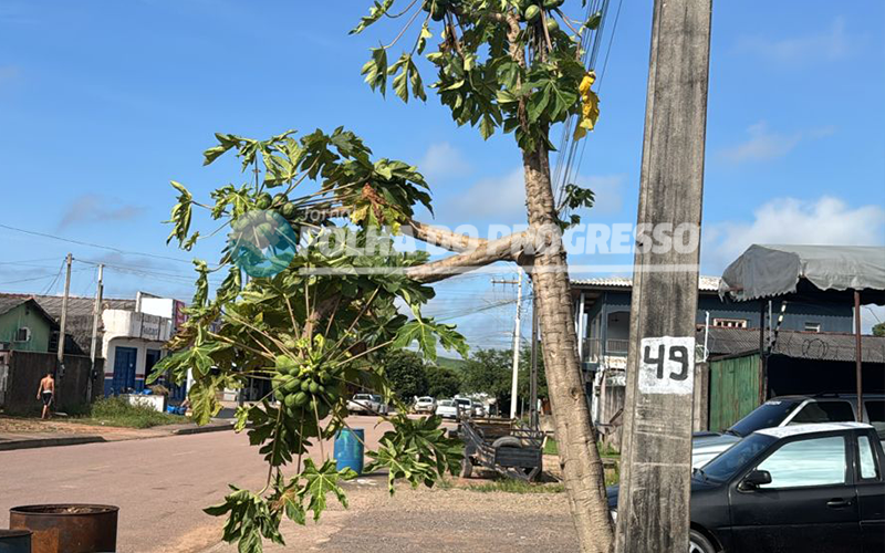 Foto: Jornal Folha do Progresso | Em uma cena inusitada, um pé de mamão está sobrevivendo e carregado de frutos no centro da cidade. Mesmo cercado por asfalto e construções, a planta se destaca como um exemplo da força e resiliência da natureza, mostrando que, mesmo nos ambientes mais desafiadores, a vida encontra um jeito de florescer. As imagens desse símbolo de resistência encantam moradores e lembram a todos a importância de cuidar e valorizar o verde ao nosso redor.