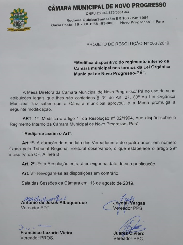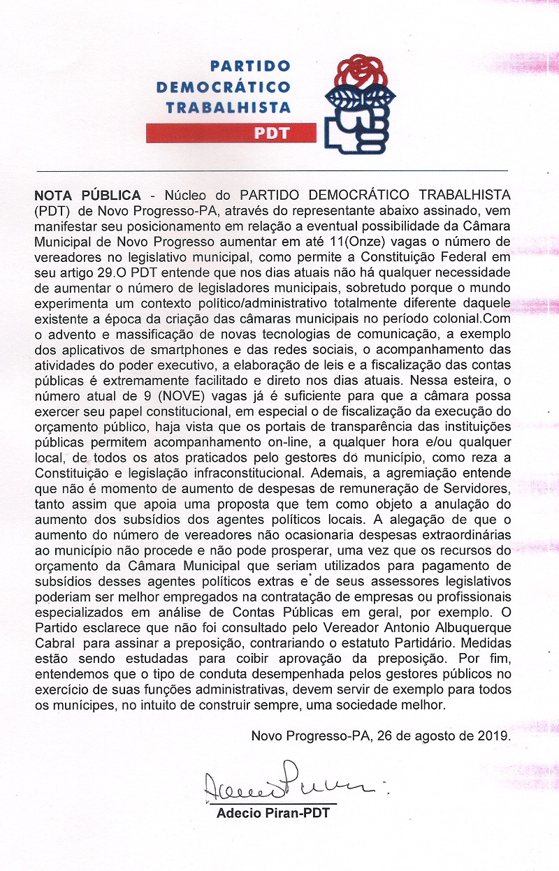 NOTA PÚBLICA– Núcleo do PARTIDO DEMOCRÁTICO TRABALHISTA (PDT) de Novo Progresso, através do representante abaixo assinado, vem manifestar seu posicionamento em relação a eventual possibilidade da Câmara Municipal de Novo Progresso aumentar em até 11(Onze) vagas o número de vereadores no legislativo municipal, como permite a Constituição Federal em seu artigo 29.