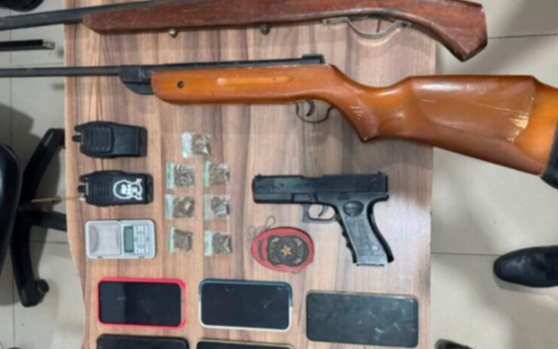 A dupla foi capturada e, após a abordagem, foram encontrados um simulacro, duas armas de fogo, sete aparelhos celulares, sete papelotes de material semelhante à maconha, com aproximadamente 20g, uma balança de precisão e dois rádios comunicadores.