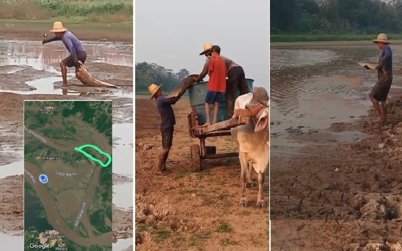 Diante desse cenário, pescadores estão organizando mutirões para transferir pirarucus de áreas secas e com baixa concentração de oxigênio para lagos e canais onde ainda há condições mínimas para a sobrevivência dos peixes.