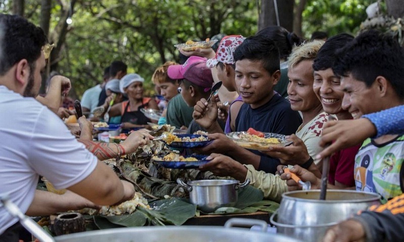 Na viagem, o grupo provou o peixe feito pelos indígenas e cozinhou um banquetaço para a aldeia. Prepararam a iguaria com arroz, em tiraditos, ensopado e assado na folha de bananeira.