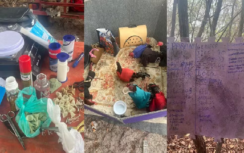 Segundo a polícia, um dos suspeitos foi alcançado e, com ele, foram encontrados medicamentos, seringas, agulhas, um facão e bicos de aço — materiais utilizados na preparação dos galos para as disputas.