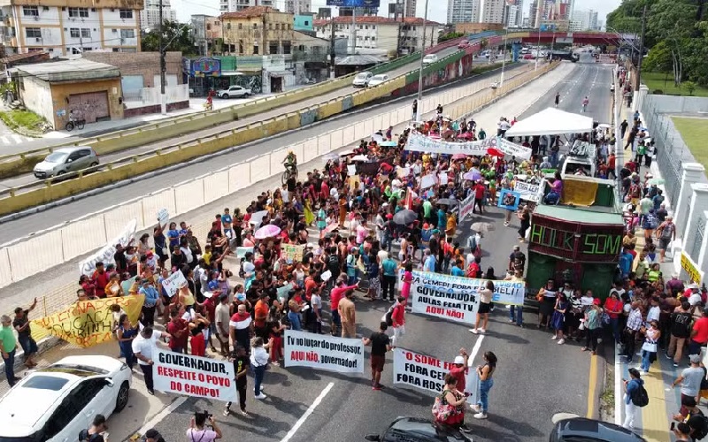 Um grupo de professores, pais e estudantes iniciaram um protesto nesta terça-feira (3) em frente à sede do Governo do Estado, no Marco, em Belém, contra medida do governo que substitui professores por televisões no Sistema de Organização Modular de Ensino (SOME).