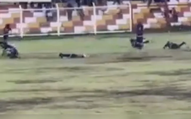 Após o impacto de um raio em jogador, diversos outros atletas desabaram no gramado. | Foto: Reprodução/X (antigo Twitter)