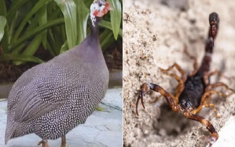 As galinhas-d’angola possuem hábitos forrageadores, ou seja, passam grande parte do tempo procurando alimento no solo. Com uma visão aguçada, elas conseguem identificar presas, como escorpiões, mesmo em meio à vegetação densa. Essa capacidade é explicada pela diferença nos hábitos: enquanto as galinhas são diurnas, os escorpiões são noturnos e costumam se abrigar em locais que podem ser explorados pelas aves durante o dia.