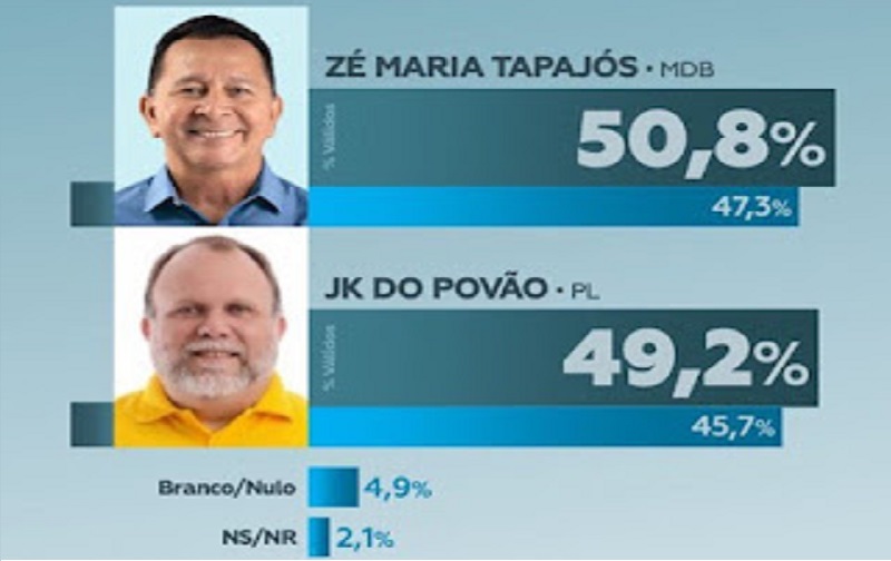 Pesquisa realizada por um instituto de Minas Gerais (MG) sobre o 2º turno em Santarém (PA) registra empate técnico entre os candidatos a prefeito. Zé Maria Tapajós (MDB) tem 50,8% das intenções de votos ante 49,2% de JK do Povão (PL). A margem de erro da pesquisa é de 3,5 pontos percentuais, para mais ou para menos.