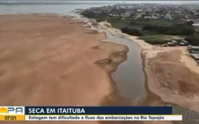 A cidade de Itaituba, no sudoeste do Pará, está enfrentando uma das piores secas já registradas, impactando severamente o transporte fluvial no rio Tapajós. O nível das águas diminuiu tanto que grandes faixas de areia se formaram ao longo do rio, dificultando o trânsito das embarcações que conectam comunidades ribeirinhas e o centro urbano. Trabalhadores que trabalham no transporte de cargas e passageiros na região, relatam que o tempo de viagem aumentou consideravelmente nas últimas semanas devido à baixa no rio.