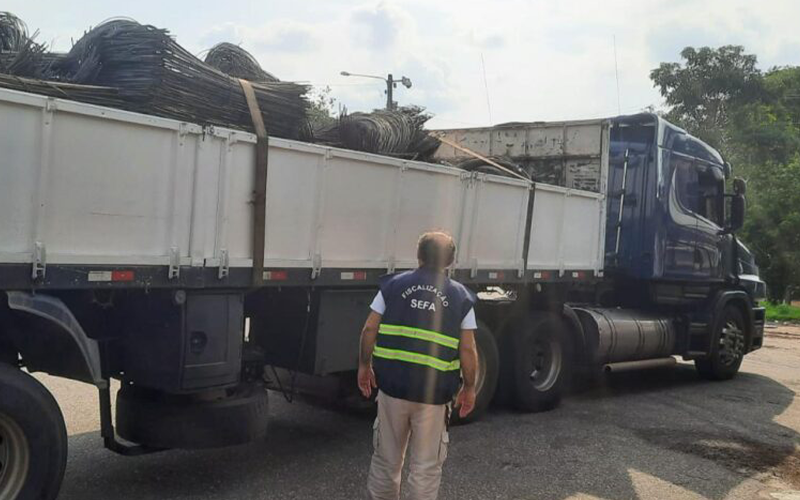 Fiscalização realizada pela Coordenação de Controle de Mercadorias em Trânsito, da Secretaria de Estado da Fazenda (Sefa), em Conceição do Araguaia, no KM-15 da Rodovia PA-447, no sul do Pará, foram apreendidas 50 toneladas de ferragem para construção, no valor de R$ 128.782,03, no sábado (02).