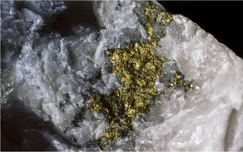 Pepitas de ouro orogênicas se formam dentro de rachaduras da pedra mineral quartzo. Crédito: Henri Koskinen/Alamy.