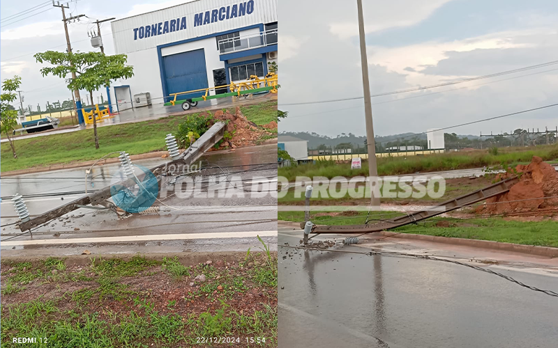Foto: Reprodução | Na tarde deste domingo, 22 de dezembro de 2024, um forte vendaval causou estragos significativos na infraestrutura de energia elétrica em Novo Progresso. Uma sequência de postes foi derrubada na saída da cidade em direção à MT, comprometendo o fornecimento de energia para o município.