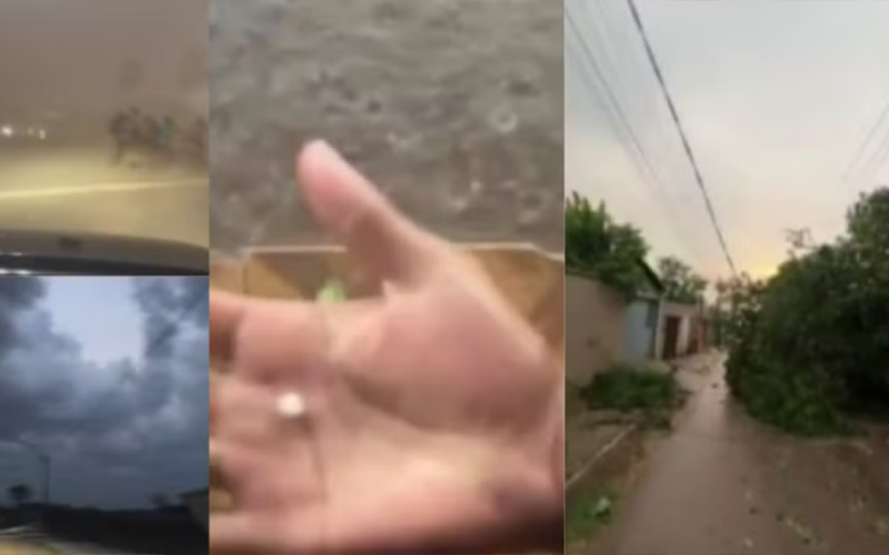 Em outro vídeo, um grupo de pessoas é gravado parado em meio à poeira espalhada pela ventania, os prejuízos foram muitos.