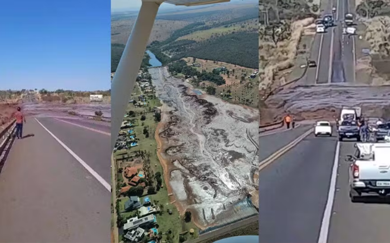 A Polícia Rodoviária Federal (PRF) registrou interdição total na pista. A corporação confirmou o rompimento e os danos na rodovia.