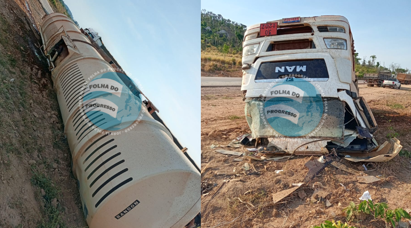 De acordo com informações não oficiais, um caminhão graneleiro teria fechado a passagem de um caminhão-tanque, que saiu da pista e tombou. O impacto foi tão forte que o tanque se desprendeu do cavalinho, deixando a cabine completamente destruída.