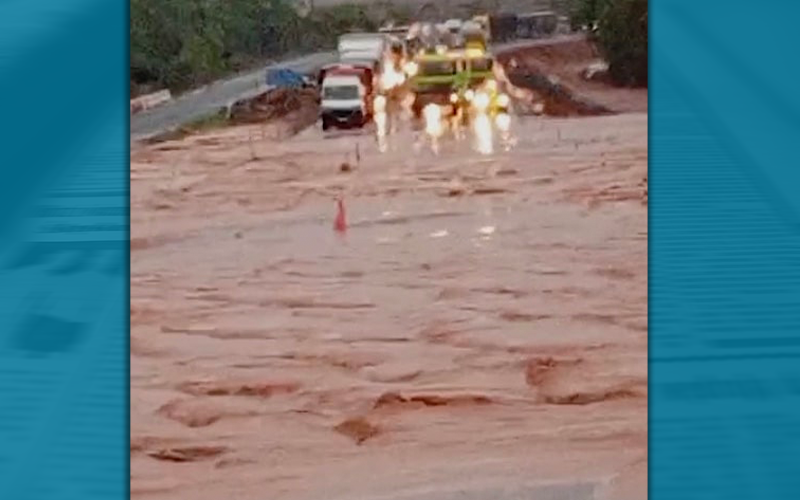 Foto: Reprodução | Chove forte desde ontem à noite em Mutum. Nas proximidades do rio dos Patos (cerca de 15 km da cidade) as águas invadiram a rodovia interrompendo o tráfego de carretas e veículos. A confirmação foi feita pela concessionária Nova Rota Oeste.