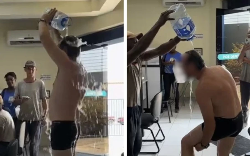 Em um vídeo registrado por moradores que estavam no local, é possível ver que o homem retira as roupas e, apenas de cueca, se lava com um galão de água e um sabonete. Comovidos com a situação, outros moradores participaram do ato e, além de começarem a filmar, auxiliaram o término do banho jogando mais água.