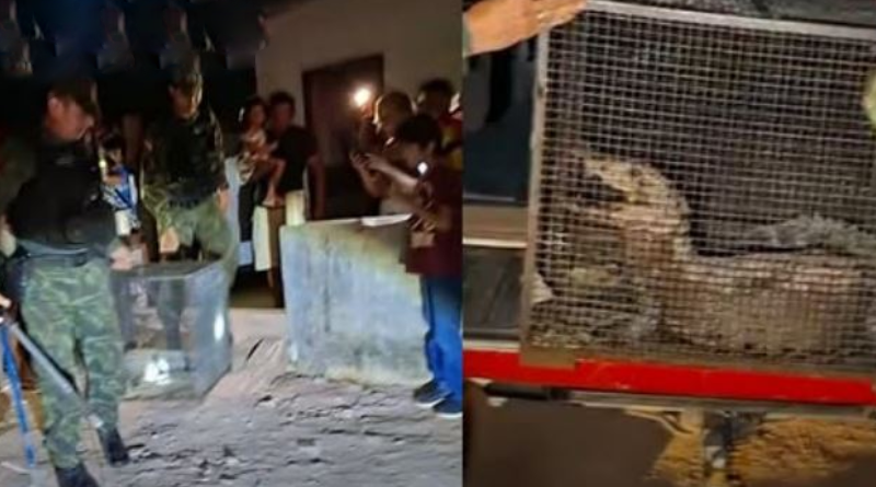 Foto: Reprodução | O que era para ser uma noite tranquila se transformou em um susto para moradores do bairro Nova República, em Santarém, nesta quarta-feira (1). Um jacaré-açu, com aproximadamente 20 kg, invadiu uma residência localizada na Travessa 26.